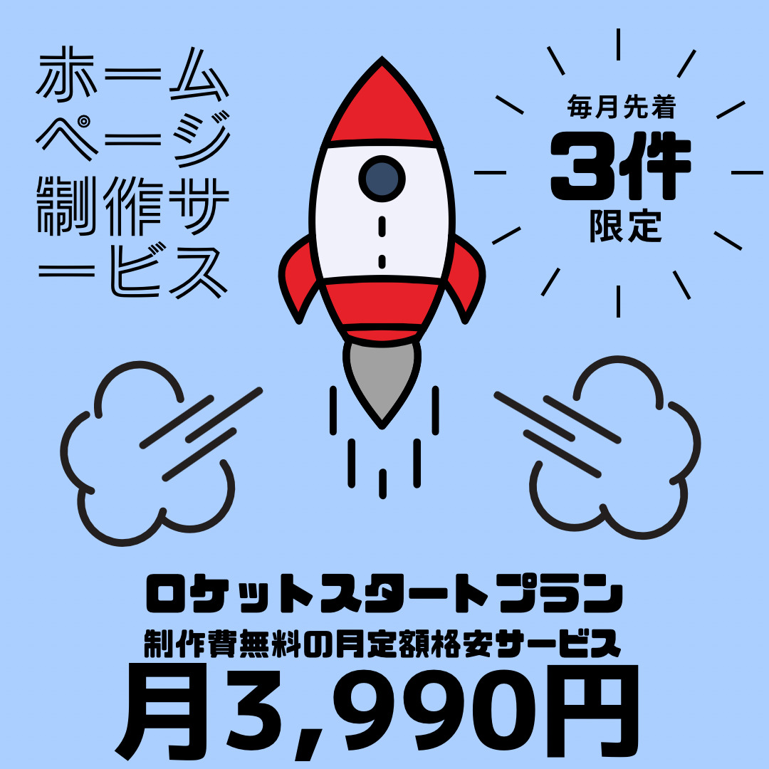ホームページのお悩みを解決!「全国対応」の格安制作費無料のロケットスタートプラン「月額」3,990円(税込)は複雑な事は一切ぬき!ホームページ制作から日々の運用までをワンパッケージでご提供いたします